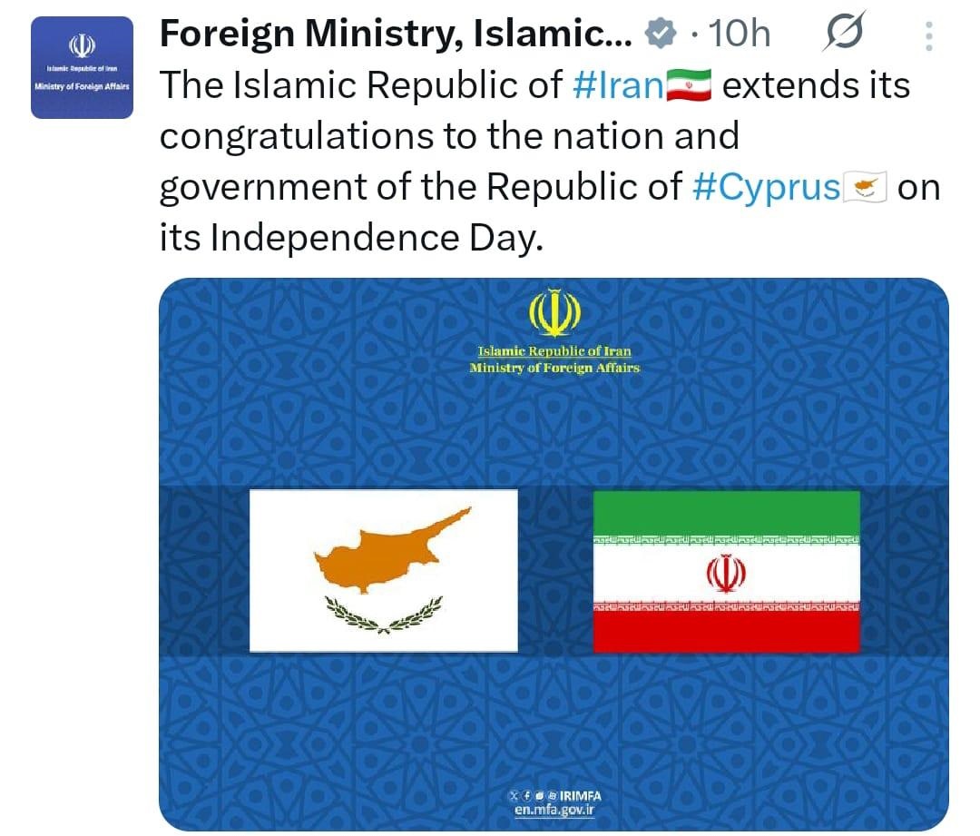 وزارت امور خارجه جمهوری اسلامی ایران با انتشار پیامی در شبکه اجتماعی ایکس، روز سالروز استقلال قبرس را به ملت و دولت این کشور تبریک گفت. جناب آقای دکتر عراقچی، وزیر امور خارجه کشورمان نیز چنی پیش در پیامی رسمی، این روز را به کنستانتینوس کمبوس، همتای قبرسی خود تبریک گفت.